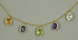 Collier aus 585er Gelbgold mit fünf ovalen Farbsteinen, je ca. 9,5x7,5 mm Zitrin, Iolith, Peridot, Amethyst, Aquamarin Rundankerkette, Federringverschluß