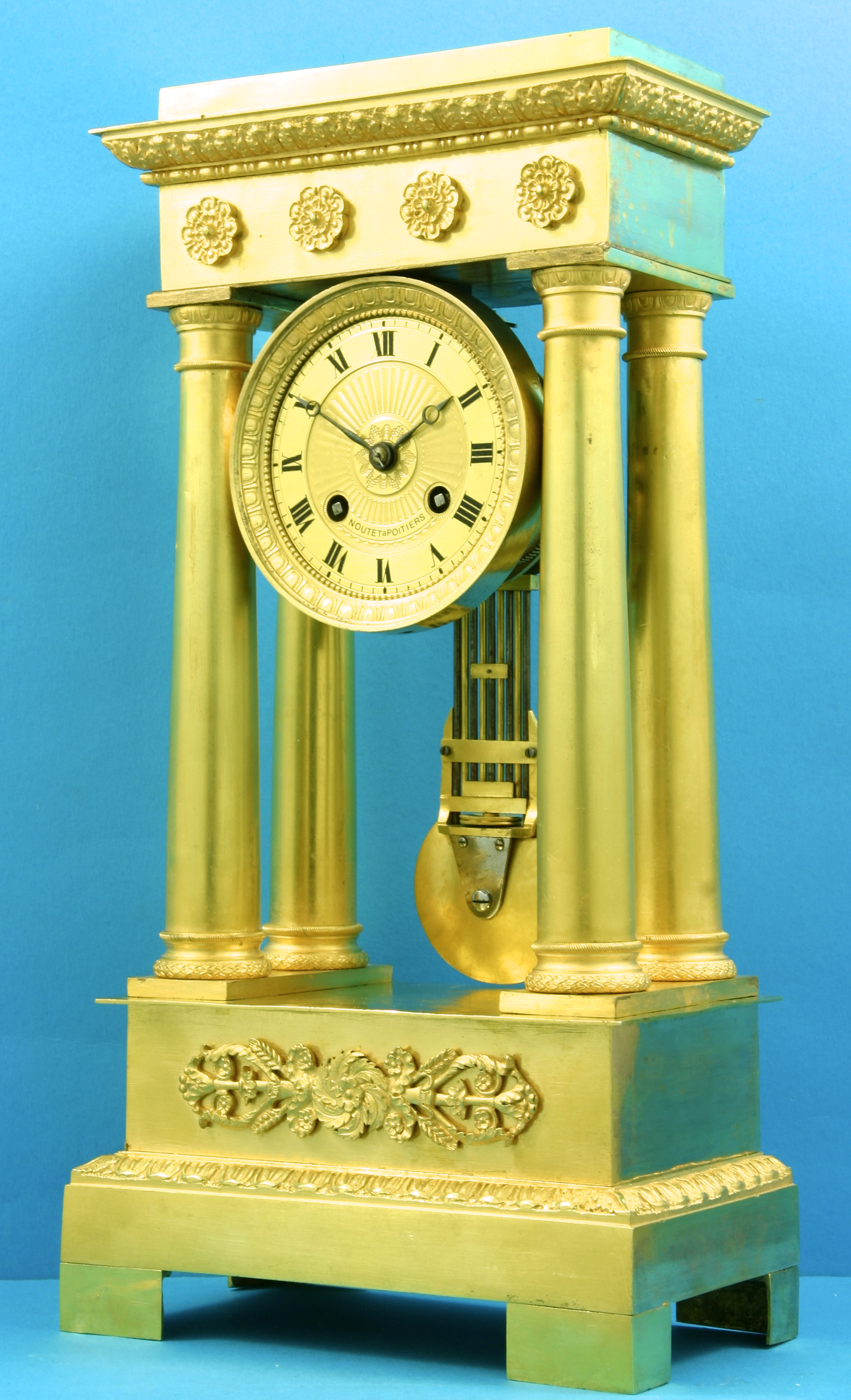 Sehr seltene, besonders kleine, ganz feuervergoldete, französische Kaminuhr in Portalform von ca. 1830