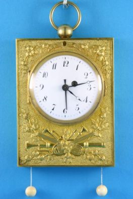 Front dekoriert mit Musikinstrumenten, weißes Emailzifferblatt mit senkrecht stehenden schwarzen arabischen Zahlen, gebläuten Stahlzeigern in Breguetform, ein schlichter Zeiger zur Einstellung der Weckzeit.