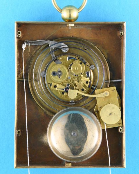 Französische Reiseuhr/Kutschenuhr/Schlafzimmeruhr von ca. 1810 in einem gegossenen, ziselierten und feuervergoldeten Messinggehäuse ( Gießerstempel auf der Rückseite der Front: DILLON FILS AINE )