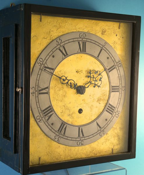 Schmiedeeisernes Zifferblatt, blattvergoldet, mit einem gravierten Zinnzahlenreif. Gesägte und gebläute Stahlzeiger