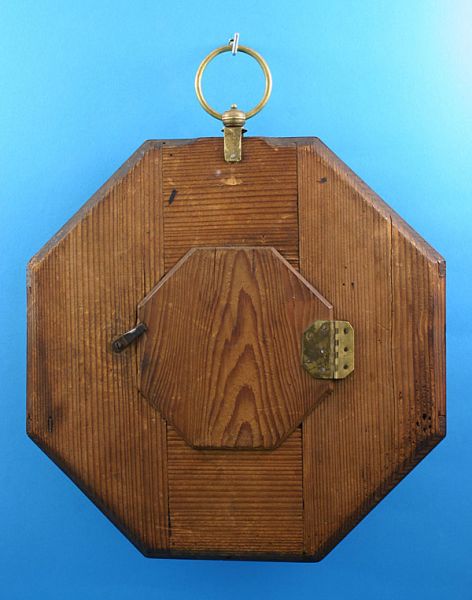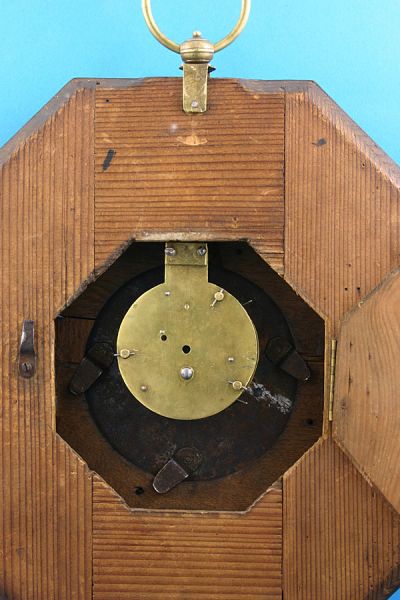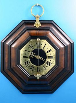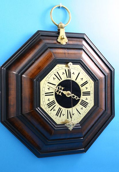 Seltene achteckige deutsche Rahmenuhr, Mitte 18. Jh. in einem polierten Holzgehäuse mit einem massiven Messing-Aufhängering