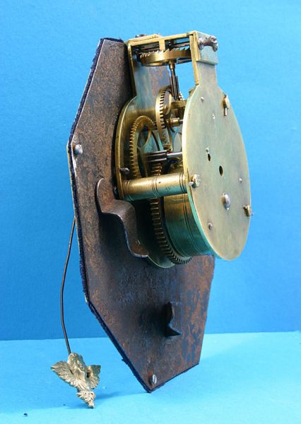 Dickes Messingzifferblatt mit ausgesägten und teilweise gravierten römischen Zahlen für die Stunden, aufgeschraubt auf eine schmiedeeiserne, mit Samt bezogene Eisenplatte. Ausgesägter und gravierter Stundenzeiger aus Messing. Massives Messinguhrwerk mit Federantrieb, Spindel-Hemmung und Vorderpendel, ein sog. Zappler.