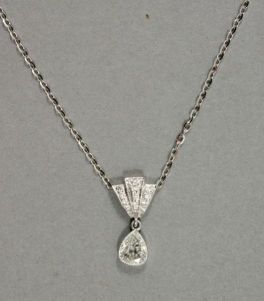 Art Deco Anhänger aus 750er Weissgold mit einem Diamant-Tropfen von 0,63 Carat, W / SI, und 12 Brillanten 0,12 Carat