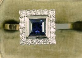 Quadratischer Art deco Ring aus 750er Gold mit einem Quadratischen Safir ca.0,69 Carat, umgeben von Brillanten o,12 Carat