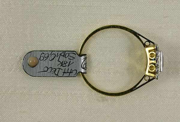 Quadratischer Art Deco Ring aus 750er Gelbgold mit Platinfassungen für einen quadratischen Saphir ca. O,69 Carat, umgeben von 20 Brillanten, zusammen ca. 0,12 Carat, TW = feines Weiß, VVS = sehr sehr keine Einschlüsse