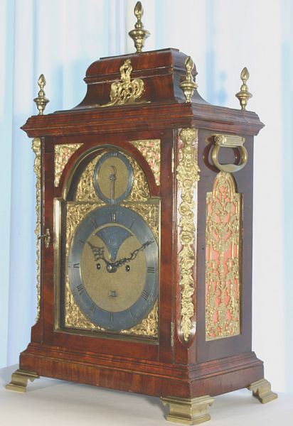 Englische Bracketclock von ca. 1760-70 in einem aufwendigen, mit Mahagoni furnierten Gehäuse.