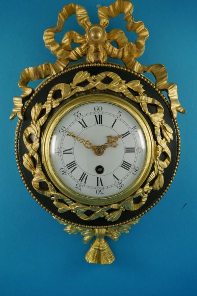 Französische Wanduhr, sog. Carteluhr von ca. 1890 in einem Gehäuse aus dunkelblau lackiertem Messing und gegossener und vergoldeter Bronze.