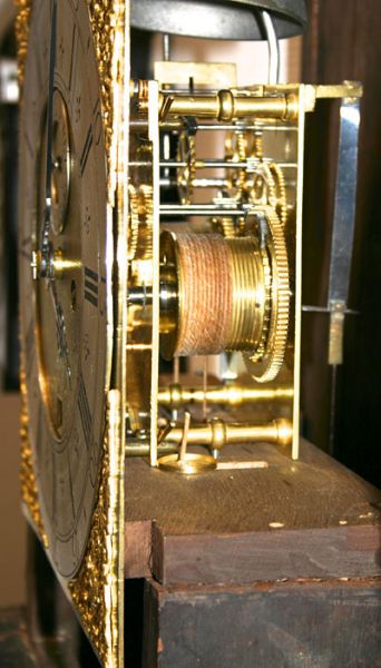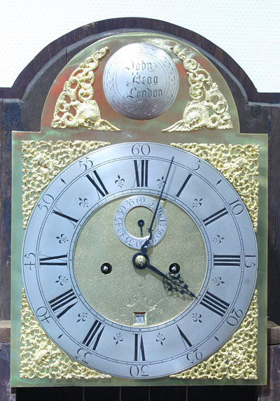 Auf einer gewölbten und versilberten Plakette im Bogen signiert: John Pegg, London, bekannt 1725 Massives Achttagewerk mit dicken Messingplatinen und fünf schön gedrehten Pfeilern, Ankerhemmung mit einem Sekunden-Pendel, Rechen-Schlagwerk für die Stunden auf Glocke Antrieb durch zwei bleigefüllte Messinggewichte über Umlenkrollen.