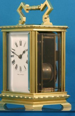 Französische Reiseuhr von ca. 1880 in einem fünffach verglasten Gehäuse aus poliertem Messing mit einem eckigen Griff