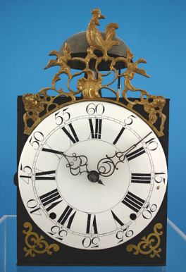 Eine der ersten im Jura hergestellten Messinggußbekrönungen mit dem gallische Hahn über Rocaillen und einem Akanthusblatt unter den Hahn.