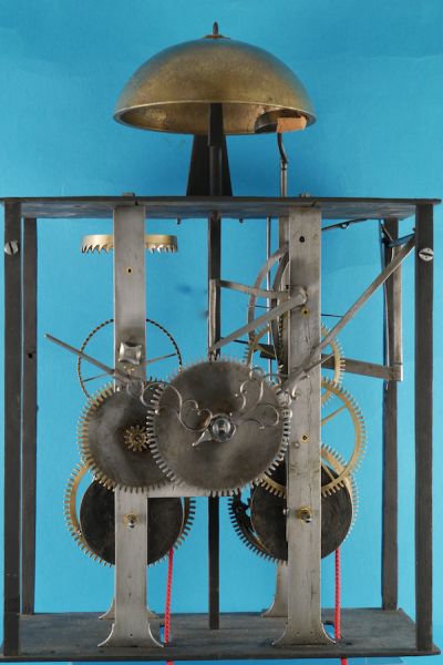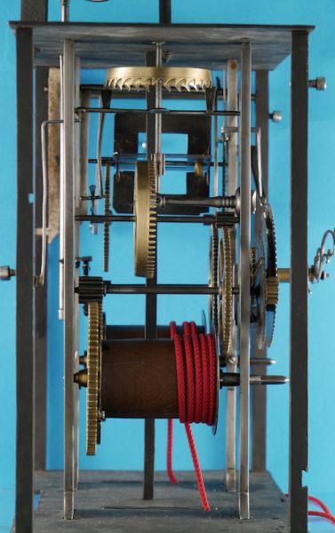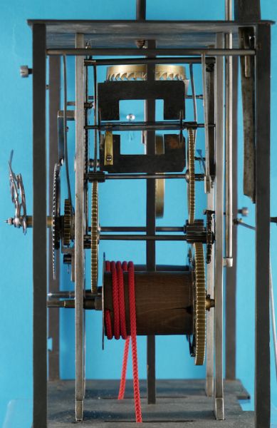 Gewichtsgetriebenes Wochenwerk mit Spindelhemmung und Faltpendel aus Draht-