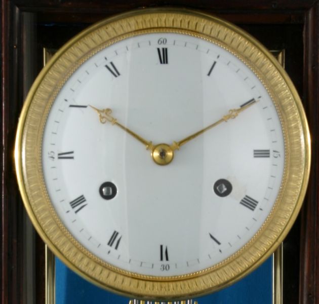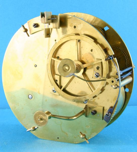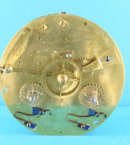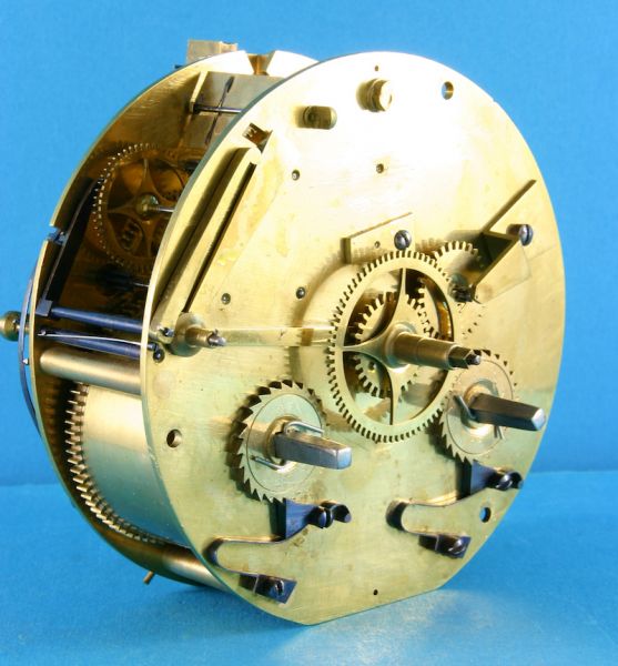 Großes massives Messing-Achttagewerk wie aus dem 18. Jh., bestehend aus hartgehämmerten Messingplatinen mit gedrehten Pfeilern, geschmiedeten und gedrehten Achsen, großen Federhäusern. Ankerhemmung mit feuervergoldetem Gitterpendel an einer Pendelfeder.