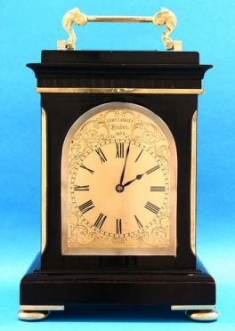 Das ebonisierte Holzgehäuse ist mit Messingappliken abgesetzt, vorne, hinten und oben verglast.
