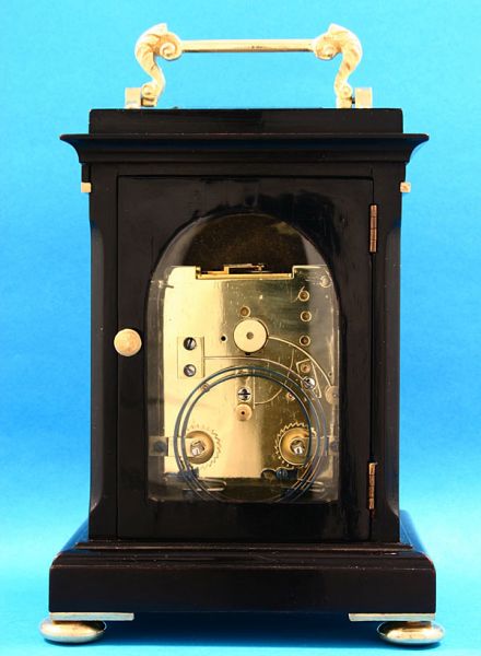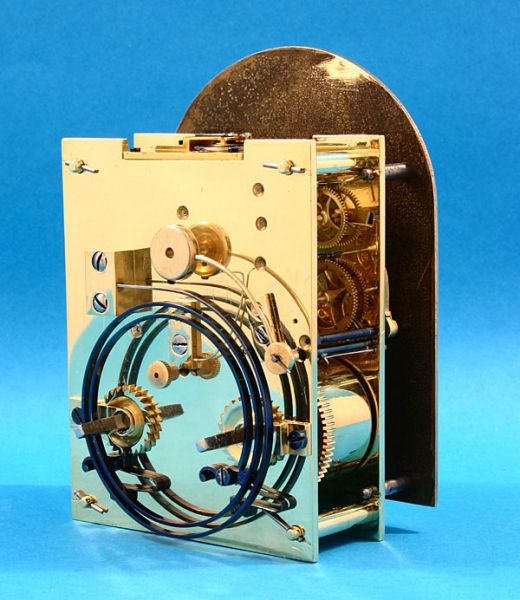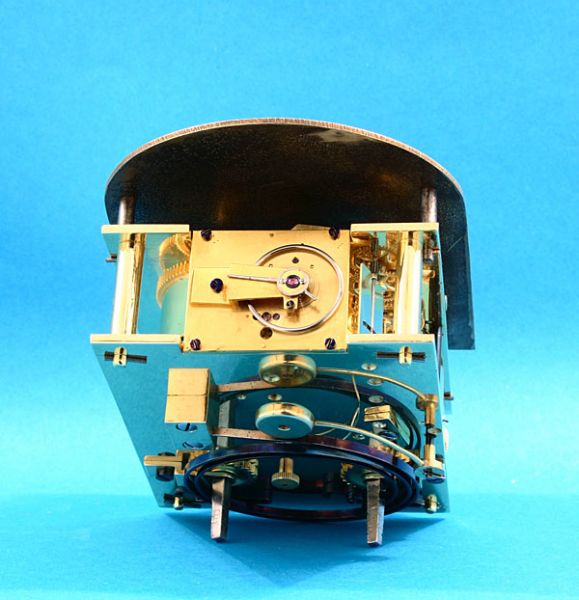 Das englische Achttagewerk ist zwischen hart gehämmerten Messingplatinen gebaut, das Uhrwerk mit einem parallel, nicht wie bei den französischen Werken rechtwinklich, angeordnetem, feuervergoldeten Plattformechappement, mit englischer Spitzzahn-ankerhemmung mit seitlich angeordnetem Stahlanker mit verdeckten Rubinpaletten und polierter Stahlunruhe.