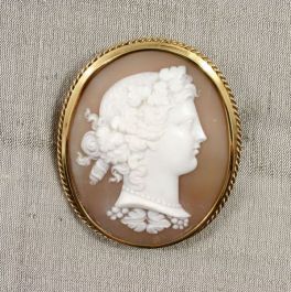 Muschel-Camee ( Gemme ) von ca. 1880, aus einer hellbraun-weißer Muschel geschnitten, darstellend ein Frauenportrait von der Seite mit Locken und Blättern im Haar