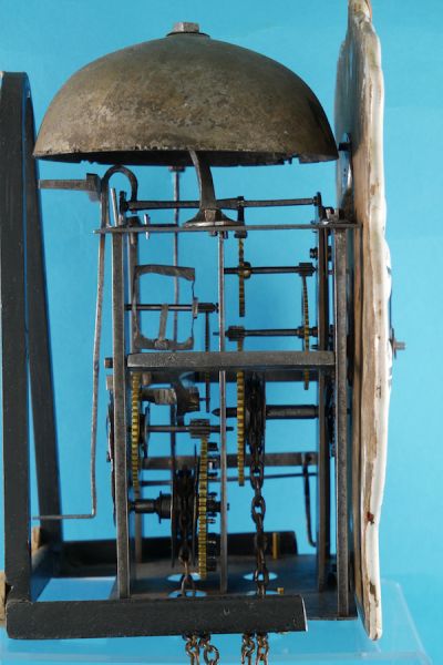 Prismenförmiges Werk aus Schmiedeeisen. Die schmiedeeiserne Deck- und Bodenplatte sind mit den eisernen Pfeilern vernietet. Die drei eisernen Platinen mit Messinglagern sind in die Bodenplatte eingesteckt und in der Deckplatte verkeilt.