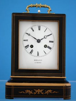 Kleine französische Kaminuhr von ca. 1840 in einem mit Palisander furniertem und intarsierten Eichenholzgehäuse, abgesetzt mit Ahorn