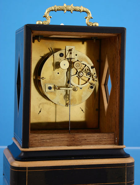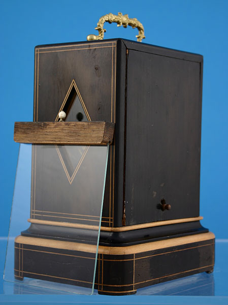 Vor dem Zifferblatt ist eine Schiebetüre eingebaut, die an dem Elfenbeinknopf nach oben gezogen werden muß, wenn man die Uhr aufziehen will. Unter dem gegossenen Messingtragegriff ist ein rechteckiges Fenster, durch das man in das Werk sehen kann.