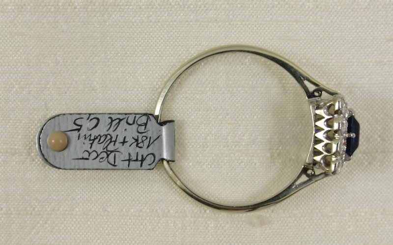 Quadratischer Art Deco Ring aus 750er Weißgold mit Platinfassungen für einen quadratischen Saphirca. 0,5 Carat, umgeben von 12 Brillanten, zusammen ca. 0,5 Carat