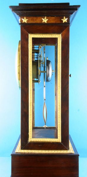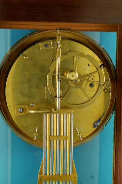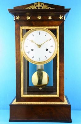 Französische Kaminuhr, sog. Régulateur de Bureau in einem Kuba-Mahagonigehäuse mit ziselierten und feuervergoldeten Bronzen, Directoire ( 1795- 99 ).