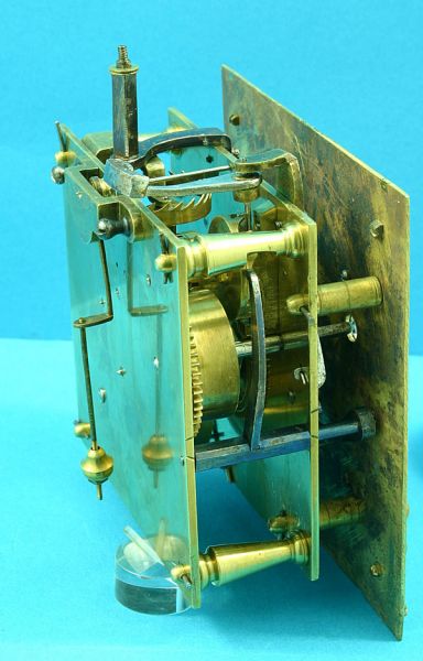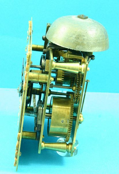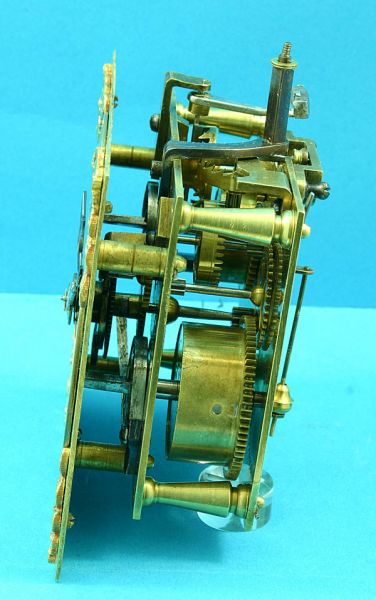 Massives Messinguhrwerk mit balusterförmigen Pfeilern, umlaufenden Federhäusern für den Wecker und das Gehwerk mit Spindelhemmung und kurzem Pendel