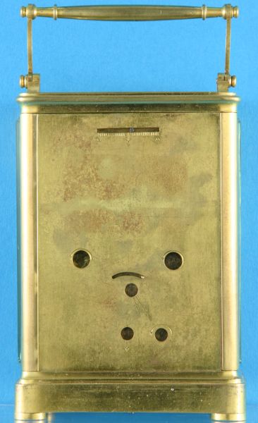 Rückwand aus Messing mit verschließbaren Öffnungen für den Aufzugsschlüssel und die Einstellung des Weckers und des Schiebers für die Regulierung der Ganggenauigkeit