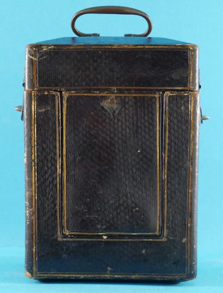 Sehr gut erhaltener Transportkasten mit einem Fach im Deckel und die Mulde für den Schlüssel im Boden.