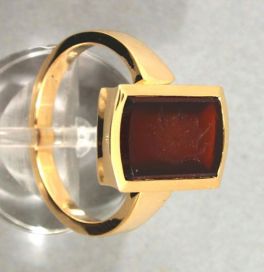 Moderner Ring aus 750 er Rotgold mit einem rechteckigen Karneol-Intaglio, darstellend einen behelmten Mann