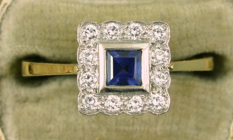 Quadratischer Art Deco Ring mit einem Safir 0,25 Carat und 12 Brillanten zus.o,23 Carat TW lupenrein