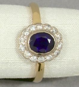 Rosetten-Ring von ca. 1910 aus 750er Gelbgold mit einem ovalen Saphir in Brillantschliff, 6x5 mm, ca. 1,1 Carat