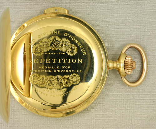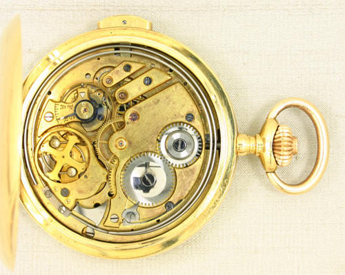 Vergoldetes Schweizer Brückenwerk mit geschliffenen und polierten Stahlteilen, Repetition der Stunden durch Schläge auf eine Tonfeder, der Viertelstunden als Doppelklang, der Minuten auf die zweite Tonfeder, gut hörbarer Klang