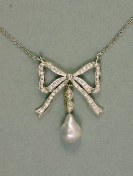 Schleifenförmiges Collier aus 750er Gelbgold mit Weißgoldfront, ca. 0,5 Carat Brillanten, tropfenförmige Zuchtperle, Ankermusterkette, Kastenschloß mit Diamanten