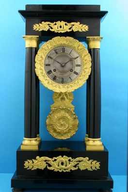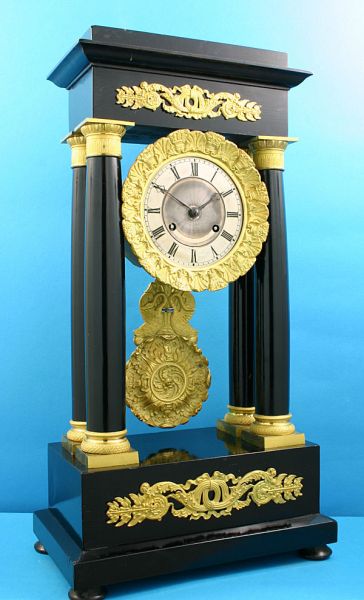 Besonders gut erhaltene französische Kaminuhr in Portalform von ca. 1830. Ebenholzfurnier schwarz poliert