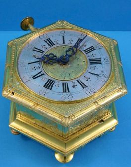 Sechseckige deutsche Tischuhr in einem gravierten und vergoldeten Gehäuse, Mitte des 18. Jh.