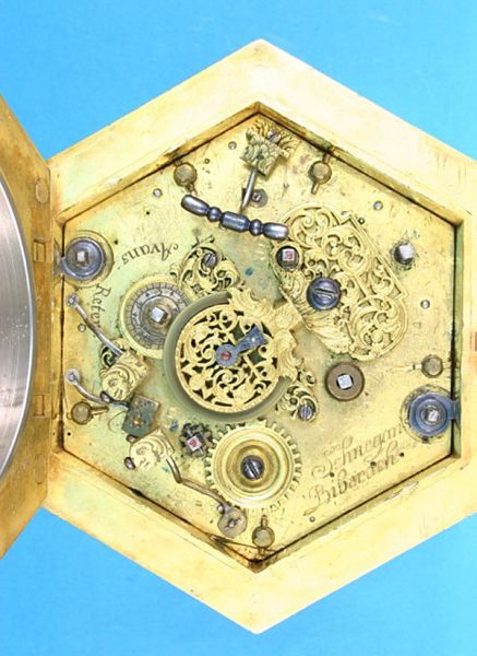 Der Antrieb des Gehwerks erfolg durch eine Feder über eine Kette und eine Schnecke als Kraftausgleich der unterschiedlichen Federkraft, wichtig für die Ganggenauigkeit der Spindelhemmung mit Messingunruhe unter einem reich gravierten Kloben.