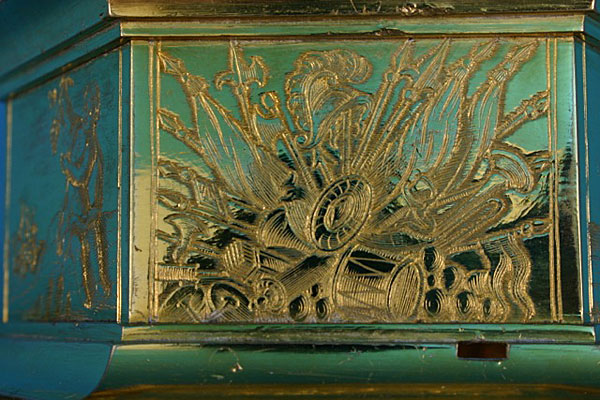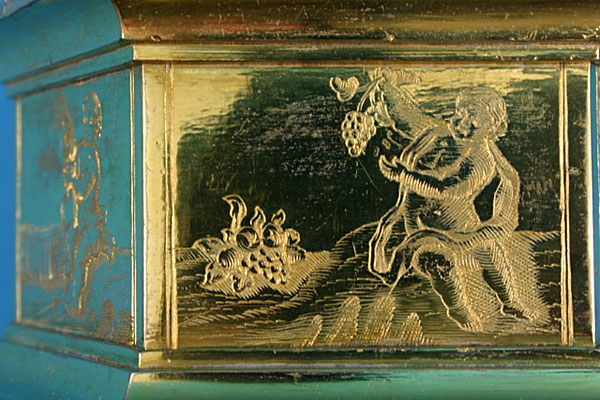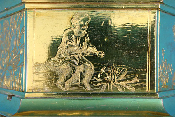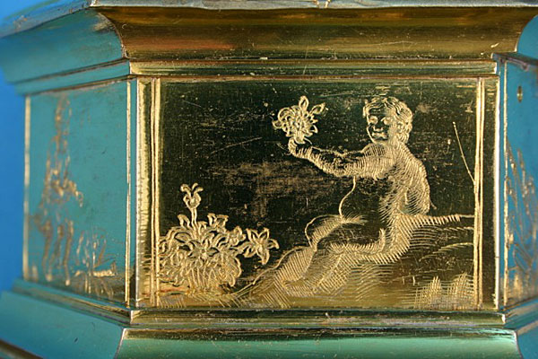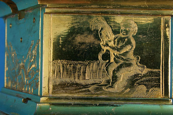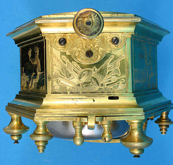 Geschnittene und gebläute Stahlzeiger.Fein gravierte Umrandung der Zifferblatts. Die sechs Seiten sind graviert, dargestellt sind die vier Jahreszeiten und Trophäen. Das Gehäuse steht auf drei gedrehten Füßen, dazwischen je ein gedrehter Zapfen.