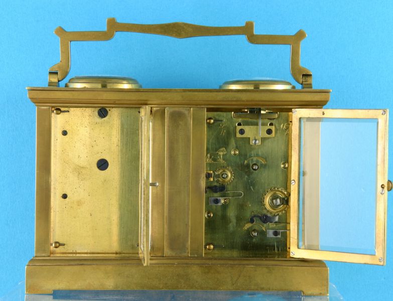 Französische Reiseuhr/Schreibtischuhr von ca. 1900 in einem sechsfach mit facettierten Scheiben verglasten Gehäuse aus gegossenem und polierten Messing