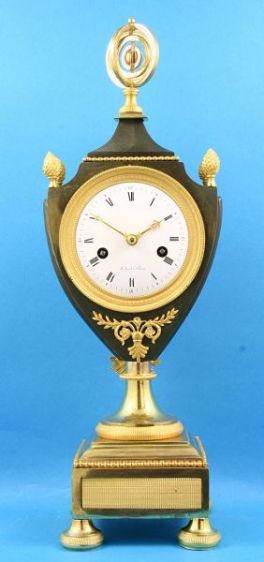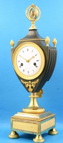 Französische Kaminuhr in Vasenform von ca. 1800, bekrönt von einer Armillarsphäre