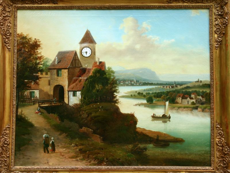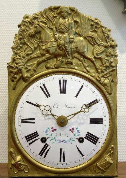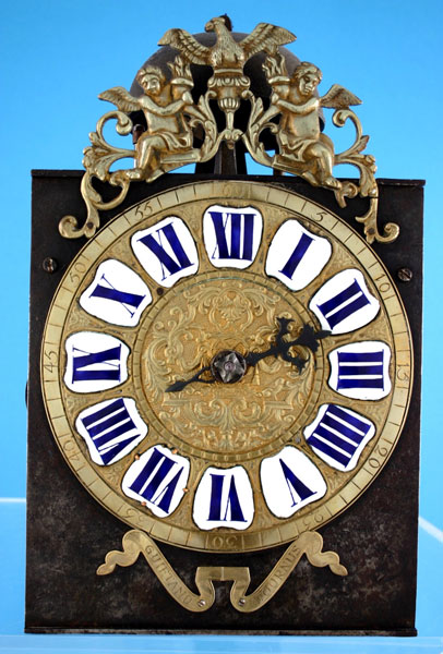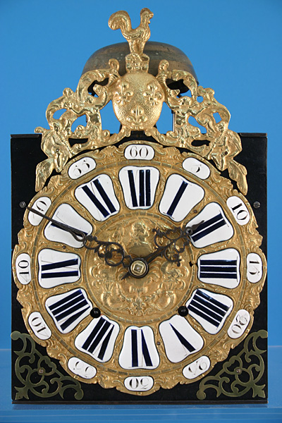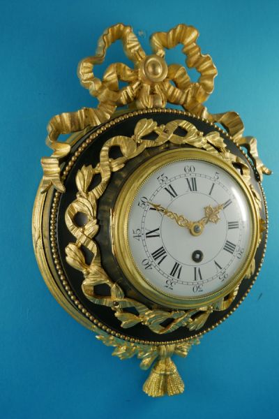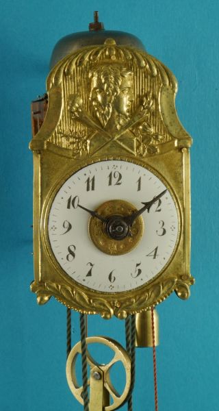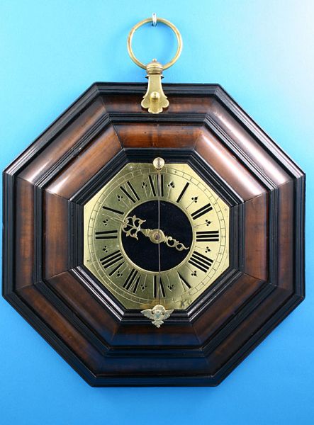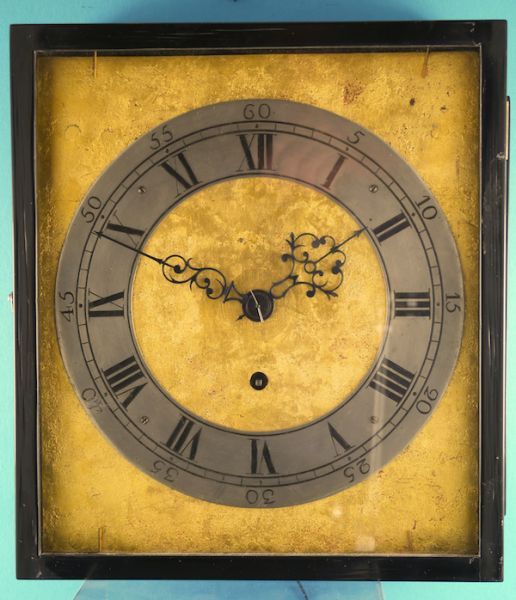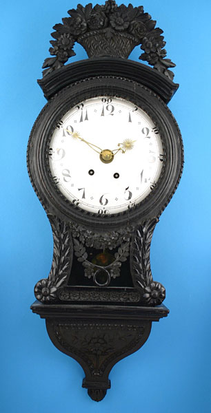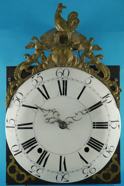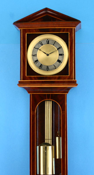 Schlanke elegante Wanduhr in einem mit Palisander furnierten Nadelholzgehäuse noch mit unterteilten Scheiben, weißes Zifferblatt mit schwarzen römischen Zahlen, eleganten gebläuten Stahlzeigern, Achttagewerk mit Pendel und Gewichtsantrieb
