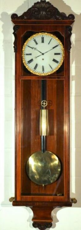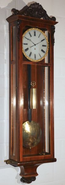 Wiener Biedermeier-Regulator, ca. 1840, in einem mit Palisanderholz furnierten und mit Ahorn abgesetzten Nadelholzgehäuse, noch mit unterteilten Scheiben. Geschnitzte Verzierungen, verm. aus Lindenholz