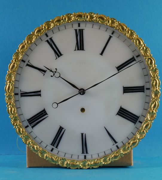 Flaches weißes Zifferblatt aus matt geätztem Beinglas mit schwarzen römischen Zahlen, eingerahmt von einer gegossenen Messinglünette, Durchmesser mit Lünette18,5 cm, elegante gebläute Stahlzeiger.
