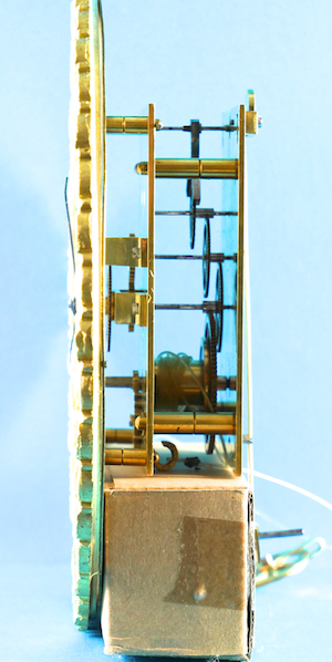 Massives Messing-Achttagewerk mit Grahamhemmung und einteiligem Stahlanker, angetrieben durch ein Messinggewicht mit einer Umlenkrolle.