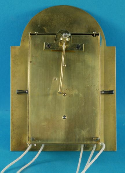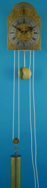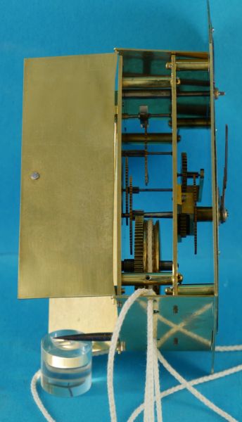 Massives Messingwerk mit Ankerhemmung mit einem Pendel an einer Fadenaufhängung, die zur Regulierung der Ganggenauigkeit an den Zeiger oben im Bogen des Zifferblattes eingestellt werden kann: Linksdrehung = langsamer